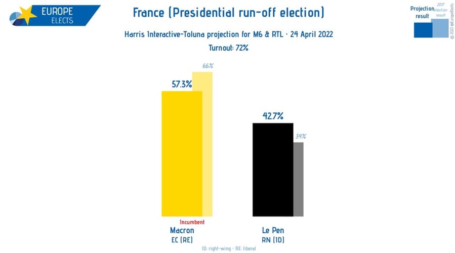 Другой экзитпол тоже присуждает победу Макрону: согласно ему, за действующего президента Франции проголосовали 57,3% избирателей, а за Ле Пен — 42,7%.