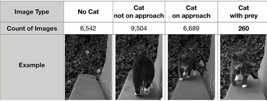Менеджер сделал 23 тысячи снимков с камеры и разделил их на четыре категории для обучения нейросети: кота нет, кот не подходит к двери, кот подходит, кот с добычей.