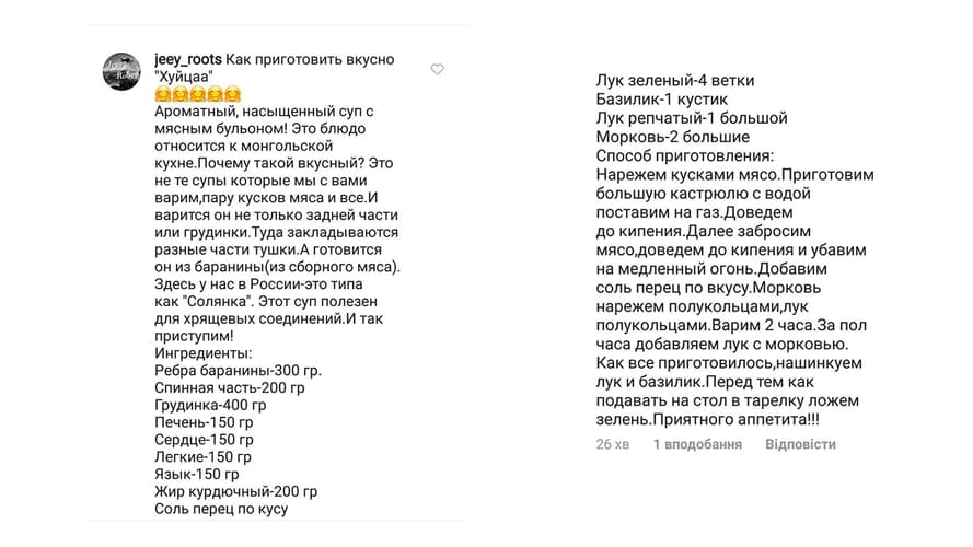 Монгольскую кухню на странице Леди Гаги представляет суп хуйцаа. Он похож на более привычную для нашей кухни солянку.