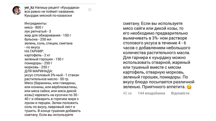 Комментарии оставляют не только россияне. Некоторые писали, что так украинцы и россияне помирятся, а некоторые требовали вернуть Крым. @yer_kz написал рецепт приготовления традиционного казахского блюда — куырдака.