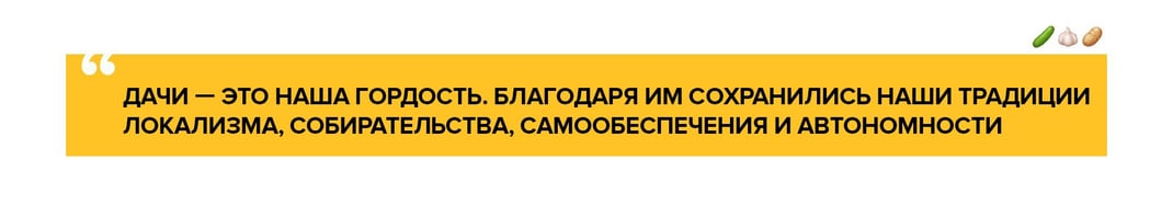 «Вот, например, дачи — это наша гордость, хотя сейчас и появилась нелюбовь к ним. Именно благодаря им сохранились наши традиции локализма, собирательства, самообеспечения и автономности. В Дании, Германии, Швейцарии я видел много дач, но там они значительно меньше — три сотки, грядки с помидорками и крошечный домик, дома стоят тесно друг к другу», — говорит Максим.