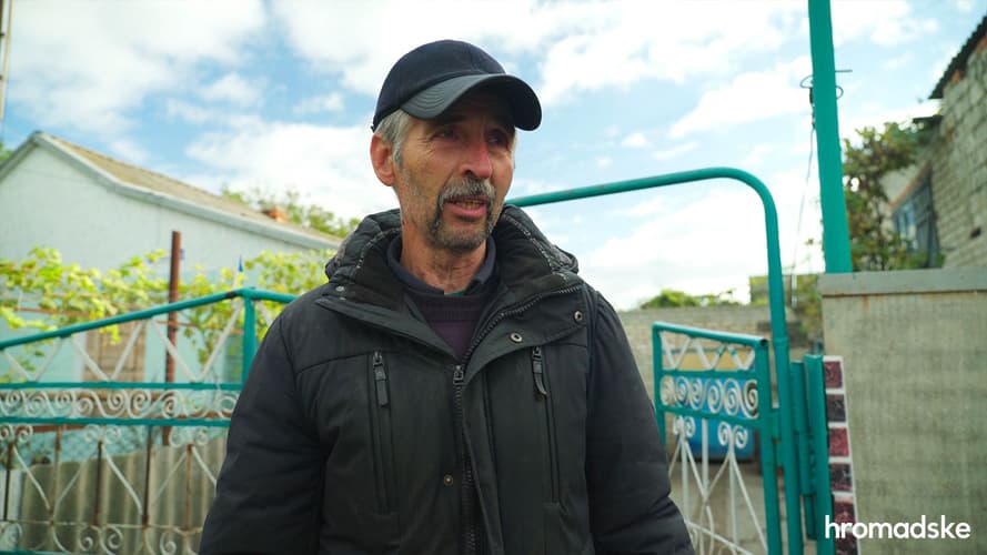 Мы идем по улице дальше. За изрешеченным красным забором видим мужчину. Он убирает у своего дома. Григорий Александрович только что вернулся домой: почти всю оккупацию прожил у сестры в соседнем селе. В его доме в это время хозяйничали россияне. Мужчина приглашает нас во двор, где стоит темно-зеленый автомобиль с буквами Z.