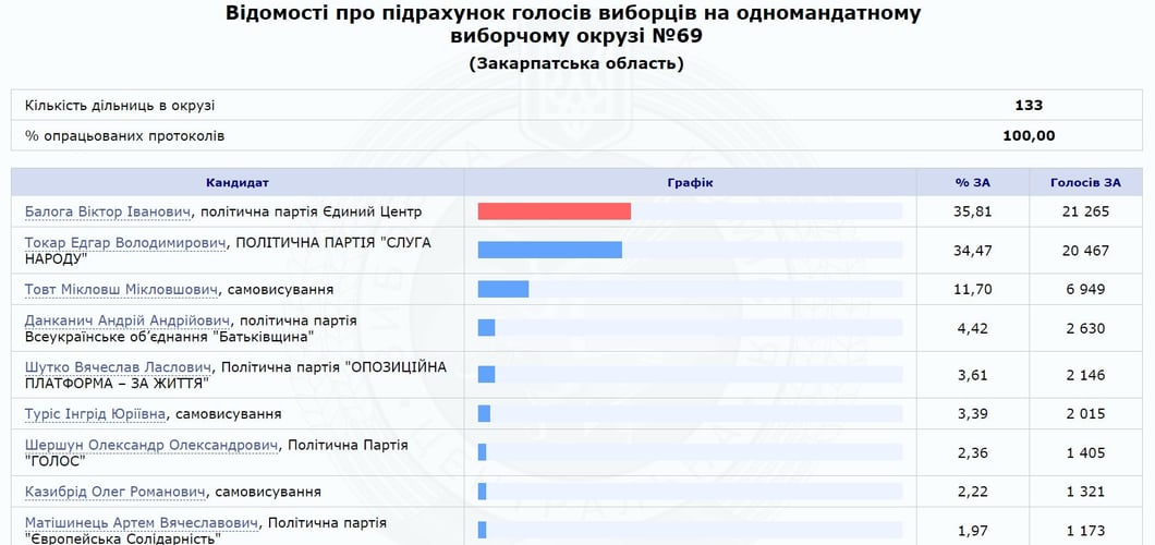 В закарпатском округе №69 народный депутат Виктор Балога побеждает кандидата от «Слуги народа» Эдгара Токара с разрывом в 798 голосов. Президентская партия уже заявила о намерении обжаловать результат.