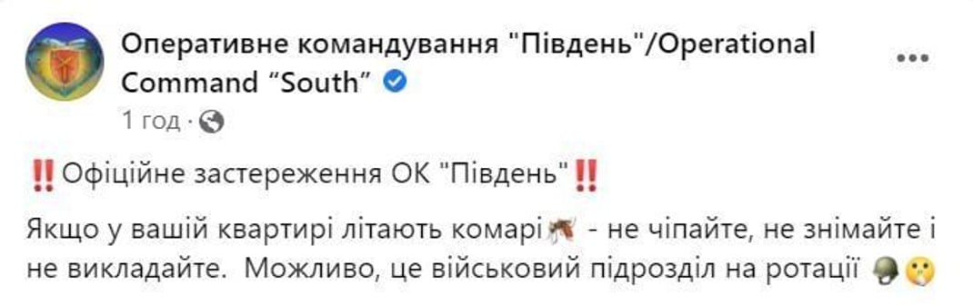 «Если в вашей квартире летают комары — не трогайте, не снимайте и не выкладывайте. Возможно, это военное подразделение на ротации», — пошутили военные.