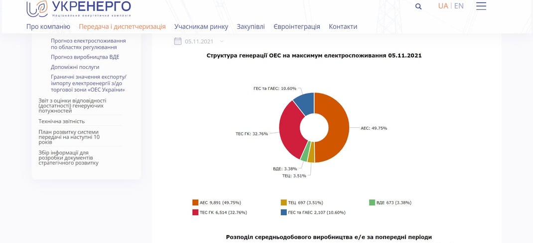 Как свидетельствует статистика «Укрэнерго», 5 ноября ТЭС произвели треть всей электроэнергии в Объединенной энергетической системе Украины — 32,76%. Большую долю (49,75%) занимает только атомная энергетика.