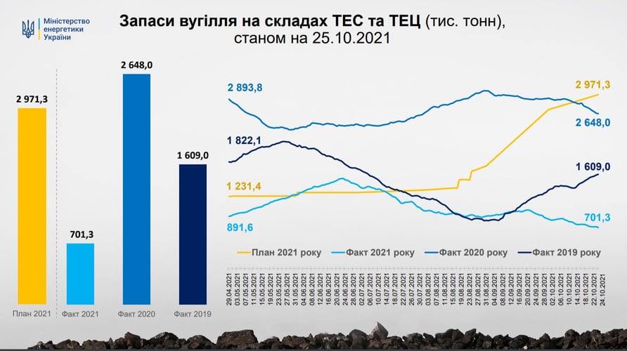 Последний раз общие данные Минэнерго публиковало 25 октября — это была крайне неутешительная статистика: 701,3 тысячи тонн фактических запасов угля, тогда как план — почти 3 миллиона. Это даже меньше необходимого минимума, который составляет 758 тысяч.
