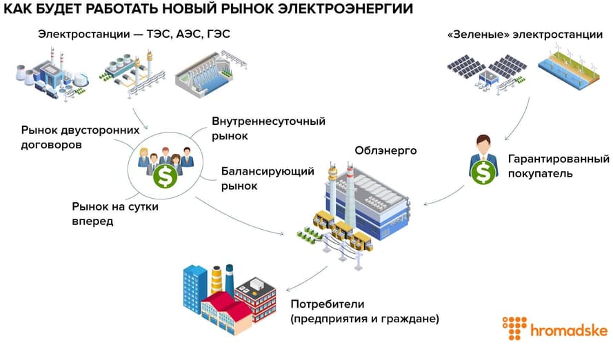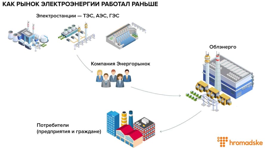 Ранее электростанции, которые производят электроэнергию, продавали ее государственной компании Энергорынок. Стоимость этой электроэнергии для каждого вида электростанций (тепловые, атомные и т.д.) устанавливал регулятор — Нацкомиссия, осуществляющая государственное регулирование в сферах энергетики и коммунальных услуг (НКРЭКУ).