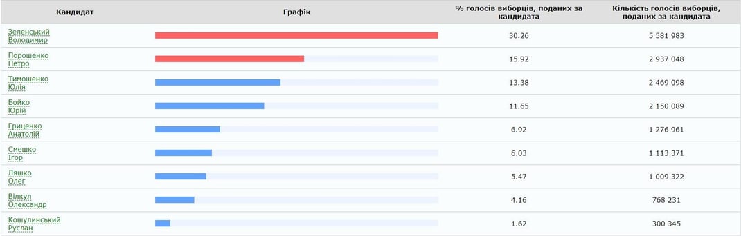 После лидеров в рейтинге идут Юлия Тимошенко (13,38%), Юрий Бойко (11,65%), Анатолий Гриценко (6,92%), Игорь Смешко (6,03%), Олег Ляшко (5,47%), Александр Вилкул (4,16), Игорь Кошулинский (1,62%). Другие кандидаты набрали менее 1% голосов.