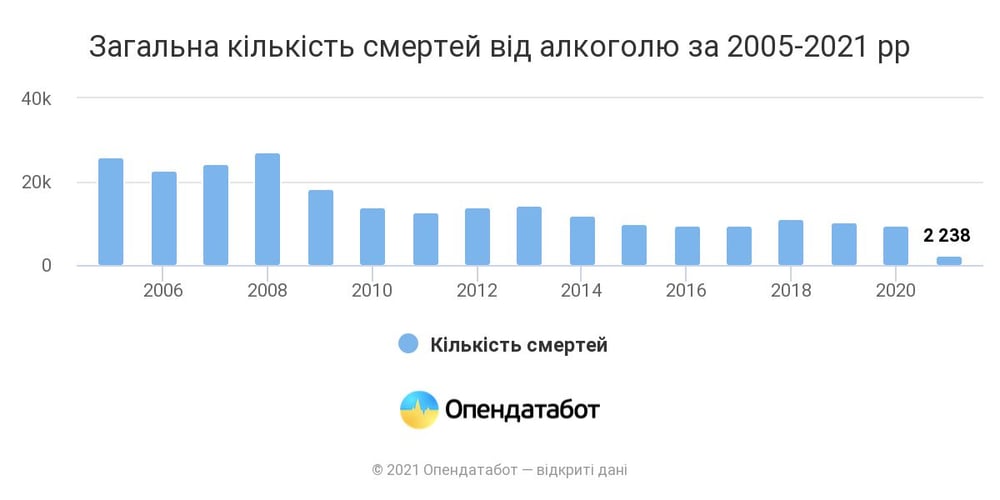 В 2020 году смертность от алкоголя в Украине снизилась в три раза по сравнению с 2008—м, с тех пор она стала постоянно снижаться. В прошлом году из—за потребления алкоголя умерли 9175 человек, тогда как 13 лет назад — более 27 тысяч.