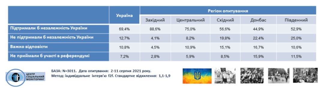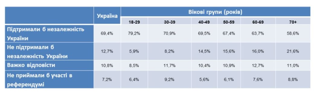 Так, если учитывать голоса среди тех, кто определился, независимость Украины поддержали бы 82,7% украинцев. В декабре 1991 года 90,32% голосовавших на всеукраинском референдуме о провозглашении независимости, отдали свой голос за.