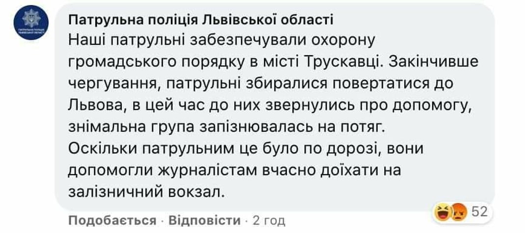В комментариях под сообщением общественного деятеля Ульяны Дидыч патрульная полиция Львовской области объяснила, что правоохранители обеспечивали охрану порядка в Трускавце, а съемочная группа обратилась за помощью, потому что опаздывала на поезд.