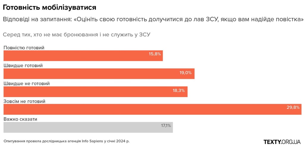 48,1% опрошенных мужчин призывного возраста в Украине не готовы мобилизоваться. Их, в частности, пугают смерть и возможность попасть к плохому командиру. В то же время 35% мужчин готовы присоединиться к Вооруженным силам Украины.