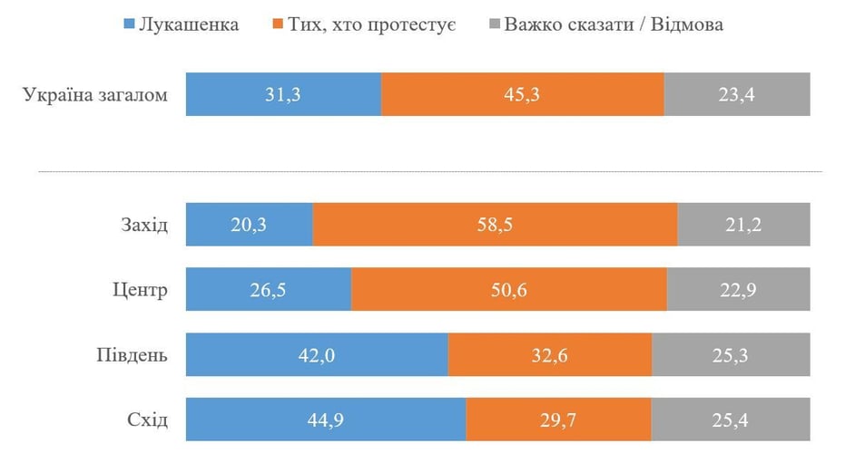 Почти треть населения Украины, а именно 31,3%, поддерживает самопровозглашённого президента Беларуси Александра Лукашенко. В то же время на стороне протестующих — 45,3%.