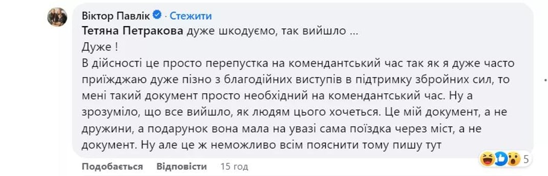 Дополнено в 11:45. В комментариях к различным сообщениям, где упоминали Павлика, певец написал свое объяснение ситуации. Он отметил, что сожалеет по поводу того, что произошло.