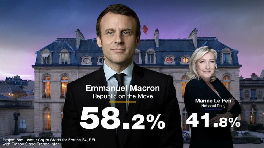 По данным экзитполов, Эмманюэль Макрон побеждает на выборах президента Франции — за него проголосовали около 58% избирателей. Его соперница Марин Ле Пен набрала около 42% голосов.