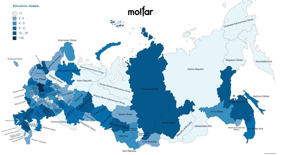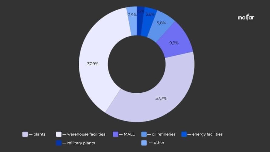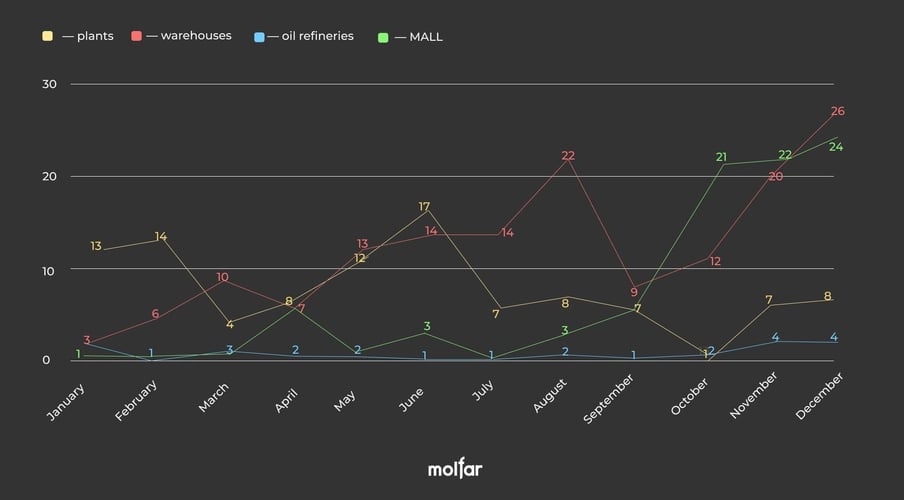 Чаще всего горели российские заводы и промышленные объекты, торгово-развлекательные центры, нефтехранилища, были взрывы и на российских газопроводах. Интересно, что МЧС россии в своих отчетах и статистике за 2021 год, например, не учитывает пожары на заводах, складах, и в ТРЦ. Только при условии, что во время пожаров там произошли взрывы. Вероятно, не станет исключением и статистика за 2022 год. Но мы поможем им составить этот отчет.