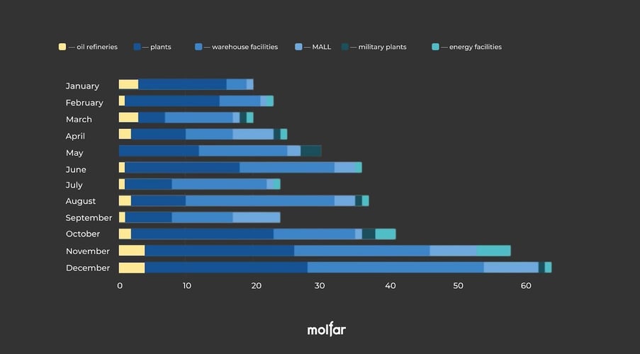 С 1 января по 31 декабря 2022 года пожары и взрывы в россии зафиксировали на 414 объектах. Только за последние два месяца прошлого года показатель в среднем вырос на 26% в месяц.