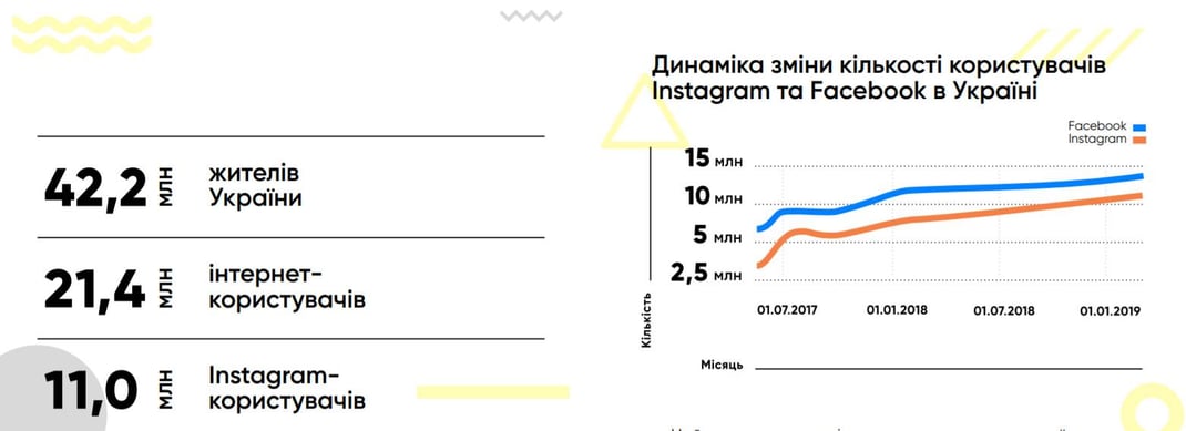 «Instagram растет значительно быстрее, чем Facebook. Если темпы роста украинской аудитории Instagram сохранятся, уже к концу 2019 эта соцсеть в Украине вплотную приблизится по объемам аудитории к Facebook (около 13 млн — ред.)», — говорится в исследовании.