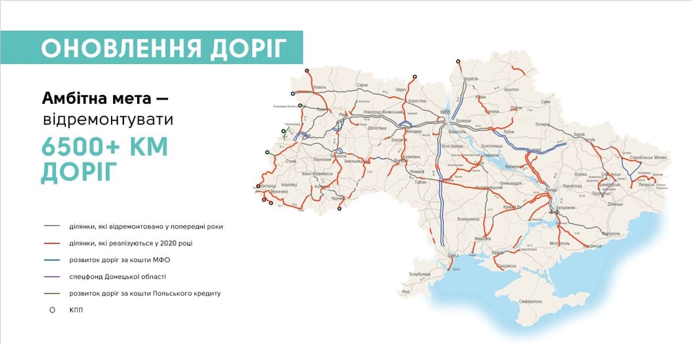 Объездные пути в 2020 году планируют построить в Днепре, Львове, Житомире, Ровно, Тернополе, Берегово, Дунаевцах и Кобылянке. В общем это 101,5 км. Также правительство планирует расширить сеть скоростных дорог.