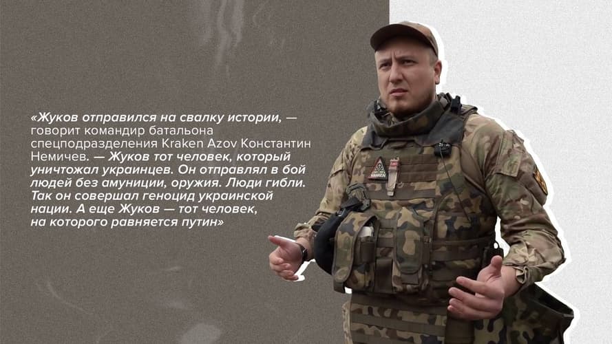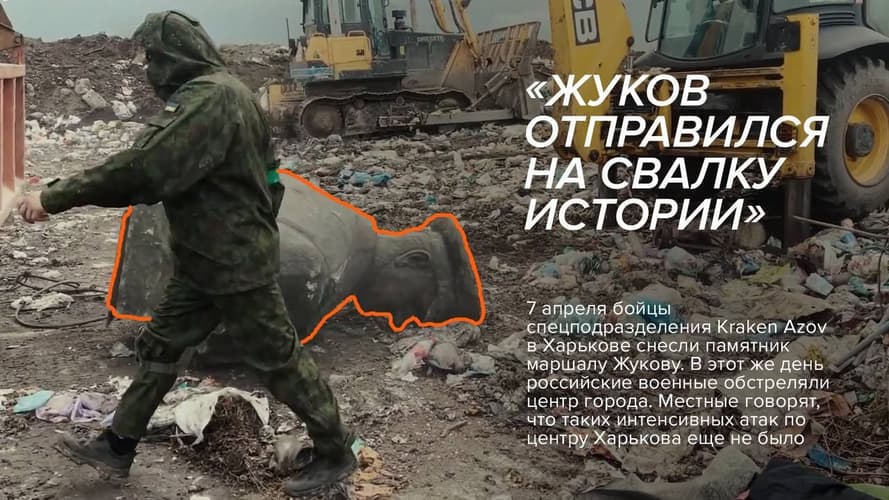 В Харькове 17 апреля был демонтирован памятник советскому маршалу Георгию Жукову. «Жуков — это человек-мясник, который обезвреживал украинцев, осуществлял геноцид украинской нации. Жуков — это тот человек, на которого равняется путин», — говорит командир отдельного батальона спецподразделения Kraken Azov.