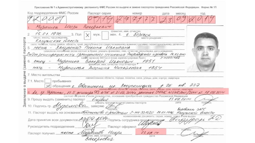 В системе «роспаспорт» сохранилось заявление Мурашова на получение российского паспорта. В нем указана и причина обретения гражданства. Как говорится в выписке, паспорт выдан на основании статьи 5 несовместимого с международным правом договора «между российской федерацией и Республикой Крым». По этой статье россия признавала граждан Украины и лиц без гражданства, на момент аннексии постоянно проживавших на полуострове, своими гражданами.