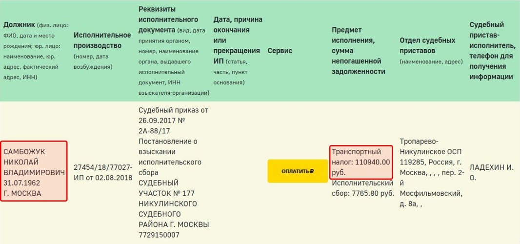 Кроме того, у Самбожука остался неуплаченный налог в россии за использование транспорта.