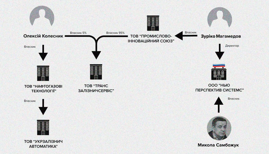 Наш анализ показал, что Самбожук через некоторых людей связан с этой украинской компанией, интересы которой продвигает на рынке вместе с Шаховым. Так, «Укржелдоравтоматикой» через ООО «Нефтегазовые технологии» владеет Алексей Колесник, у которого есть еще одна фирма — «Трансжелезнодорожный сервис». Этой фирмой через ООО «Промышленно-инновационный союз» вместе с Колесником владеет Зурико Магамедов. Он был директором в российской фирме Самбожука «Нью перспектив системс». Компания была ликвидирована в 2017 году.