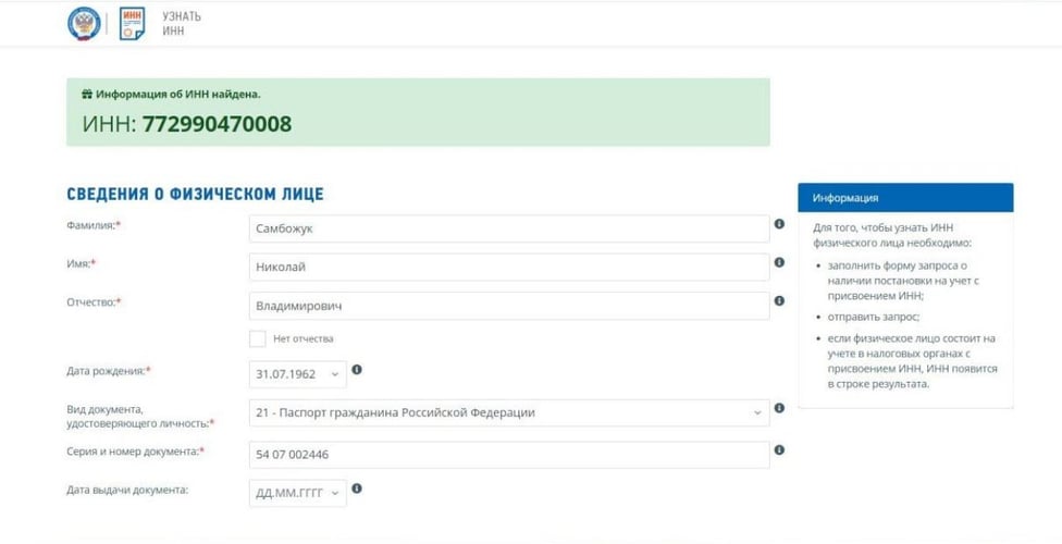 Если внести данные паспорта Николая Самбожука в официальный реестр федеральной налоговой службы рф, то можно увидеть его индивидуальный налоговый номер, который до сих пор актуален.