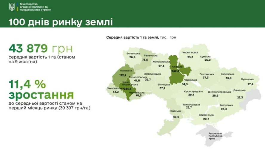 По состоянию на 9 октября средняя стоимость за 1 га земли сельскохозяйственного назначения составляет 43 879 гривен, если брать общие данные всех транзакций по землям.