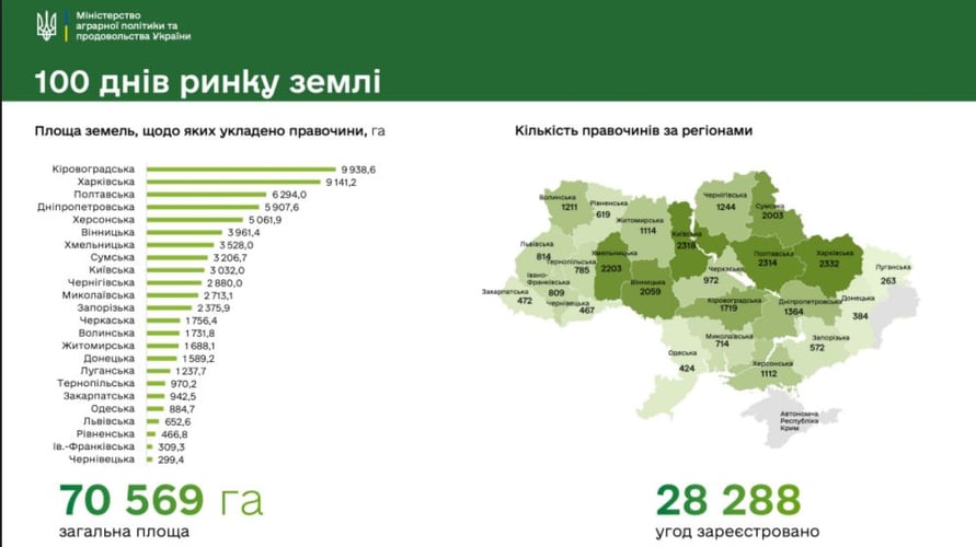 С 1 июля, когда в Украине официально заработал рынок земли сельскохозяйственного назначения, прошло более 100 дней. В Минагрополитики рассказали, что за этот период было заключено более 28 тысяч сделок на землю общей площадью 70 569 га.