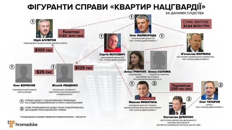 Прошлой осенью о подозрении по этому делу объявили еще и бывшему народному депутату и конечном бенефициару «Укрбуда» Максиму Микитасю. Следствие считает, что Микитась, использовав подконтрольные ему строительные компании, вместе с бывшим командующим Нацгвардией Юрием Аллеровым, генеральным директором компании-застройщика Олегом Майбородой, частной оценщицей Алисой Гринчук и другими лицами организовали коррупционную схему, чтобы завладеть недвижимостью Нацгвардии.