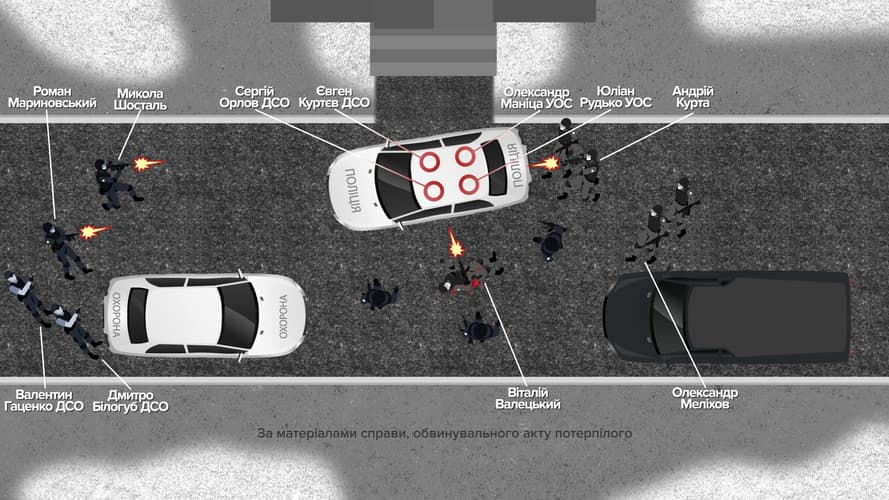 По данным следствия, Виталий Валецкий осознавал, что в автомобилях находятся полицейские. Но, тем не менее, сделал до двадцати выстрелов в окно водительской двери. Кроме этого, он и Курта минимум дважды выстрелили в сотрудников Броварского отдела полиции охраны Гаценко и Белогуба, которые находились за этим автомобилем.
