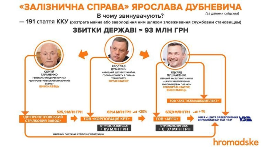 - По данным следствия, Ярослав Дубневич в течение 2015-2017 годов, будучи народным депутатом 8-го созыва и главой транспортного комитета, способствовал тому, чтобы «Укрзализныця» выделила более 500 млн грн ($20 млн) на закупку стрелочной продукции. К этому процессу, по данным следствия, он привлек связанное с собой предприятие «Днепровский стрелочный завод» и завел компании-посредники: свою ООО «Корпорация КРТ» и компанию контролируемую помощником Эдуардом Пушкаренко ООО «Арго». Они, уверяют следователи, завысили цену на продукцию, чем нанесли убытки государству в размере более 93 млн грн ($3,7 млн). В случае доказательства вины, ему грозит от 7 до 12 лет лишения свободы.