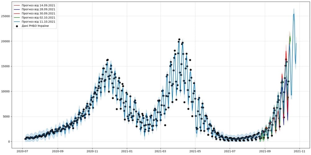 Ученые Национальной академии наук Украины прогнозируют, что уже в конце октября суточная заболеваемость COVID—19 может вырасти почти до 21 тысячи.