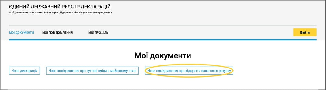 Такая возможность уже предусмотрена в личном кабинете в Реестре деклараций. Для уведомления нужно нажать кнопку «Новое сообщение об открытии валютного счета» — как на скриншоте ниже.