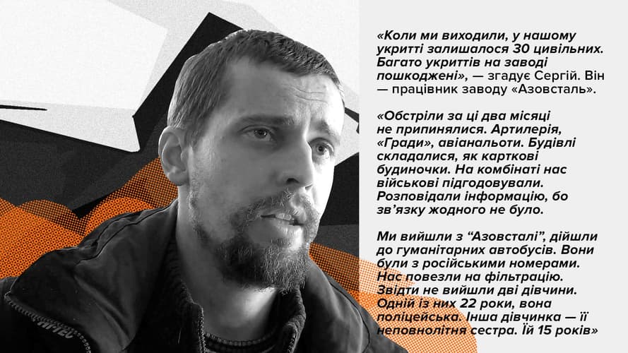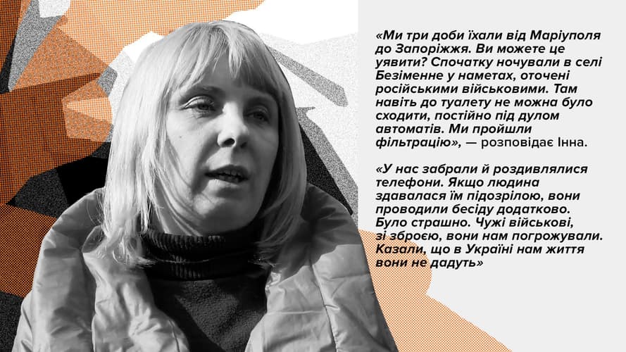 От Мариуполя до Запорожья 220 километров, однако люди ехали трое суток. Мариупольцы проходили фильтрационные лагеря на неподконтрольной Украине территории, ночевали в школе и палатках, но наконец добрались до Запорожья. Месяцы жизни на «Азовстали» они называют настоящим адом.