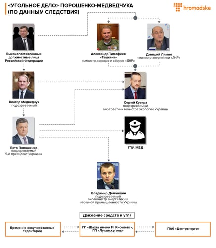 Следствие зафиксировало разговоры Медведчука с помощником президента РФ Владиславом Сурковым, во время которых они обсуждают «угольный вопрос». В схеме, по данным следствия, также участвовал бизнесмен Сергей Кузяра. Впоследствии о подозрении сообщили и бывшему министру энергетики и угольной промышленности Владимиру Демчишину — он находится в розыске. Сам политик назвал обвинения сфабрикованными.