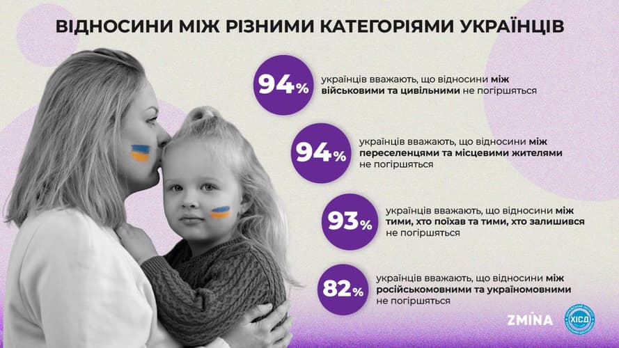 67% считают, что очень хорошими и хорошими будут отношения между военными и гражданскими, 58% — между переселенцами и местными, 55% — мигрантами в другие страны и оставшимися в Украине.