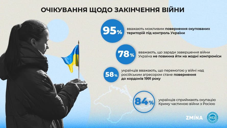 Большинство украинцев (89%) не сомневаются в возвращении под контроль Украины всех временно оккупированных территорий. Также граждане единодушны, что ради завершения войны Украина не должна идти ни на какие компромиссы.