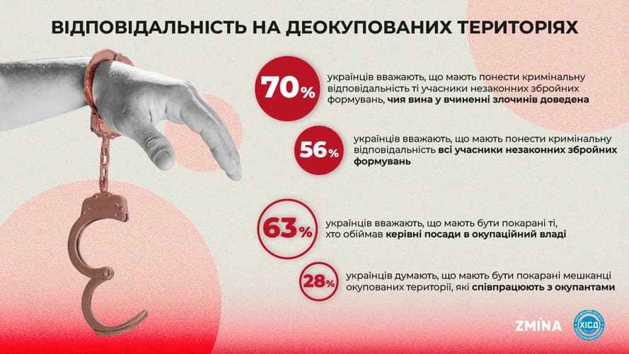 Более половины участников опроса ответили, что уголовную ответственность должны понести участники незаконных вооруженных формирований, особенно совершившие тяжкие преступления, а также руководители и сотрудники оккупационных органов.
