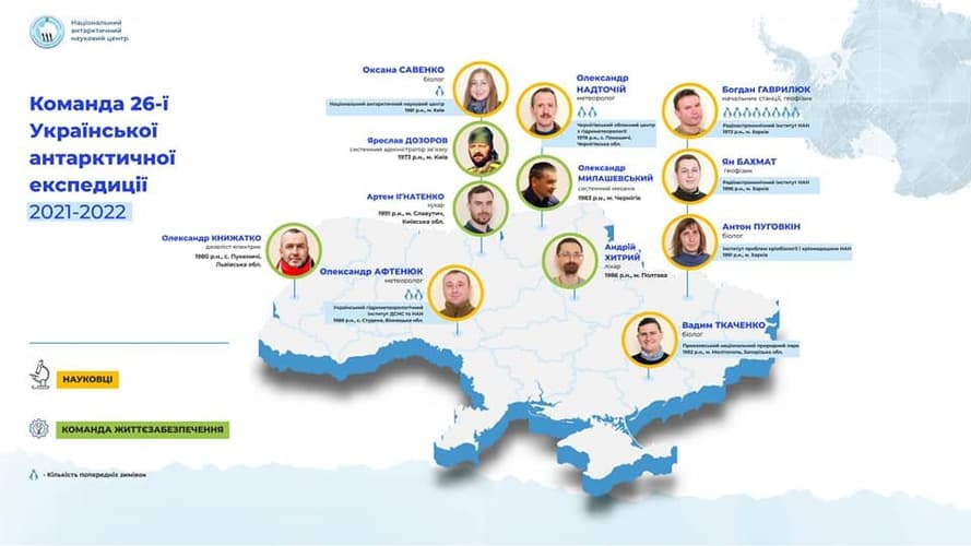 Всего в экспедиции примут участие 7 ученых, врач, повар, дизелист, системный механик и сисадмин. Среди исследователей только одна женщина — это биолог Оксана Савенко, которая уже второй раз едет на зимовку (ранее ни одна женщина в украинской экспедиции не зимовала там дважды).