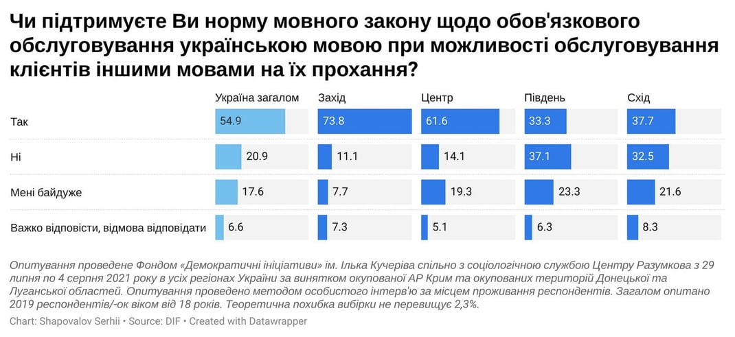 55% украинцев поддерживают норму «языкового закона» об обслуживании на украинском языке при сохранении возможности обслуживания клиентов на других языках по их просьбе.