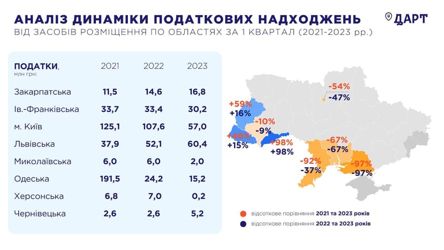 Наибольший прирост был зафиксирован в Черновицкой области — на 98%. Там за первый квартал 2023 года уплатили в бюджет 5 млн 152 тысячи грн против 2 млн 600 тысяч грн за аналогичный период 2022 года. В 2021 году от Буковины в бюджет поступила такая же сумма, как в прошлом.
