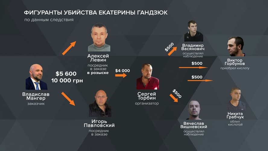 «Левин — это ключевая фигура, которая связывает исполнителей — «группу Торбина» и заказчиков — это Мангер и другие. Он организовывал это преступление, он подбирал Торбина, предоставлял другую информацию — о месте проживания Гандзюк и так далее», — рассказывал начальник следственного управления СБУ Богдан Тиводар.