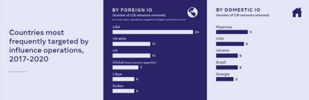 Кроме того, Украина вошла в список стран, которые чаще всего становились целью операций воздействия (IO), что в Facebook понимают как «скоординированные усилия с целью манипулирования или влияния на публичные обсуждения для стратегической цели».