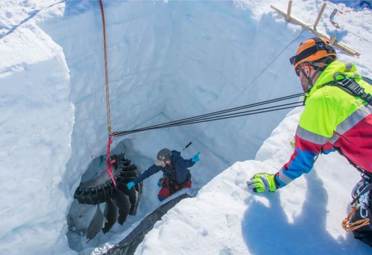 Стало понятно — нужно раскапывать несколько метров снега. Но неподалеку от этого места располагалась большая щель шириной в четыре метра, в которую во время неосторожных раскопок могли провалиться все участники экспедиции. Исследователи нашли решение: привязывали себя к грузу, который стоял неподалеку, и начали работать лопатами и бензопилами.