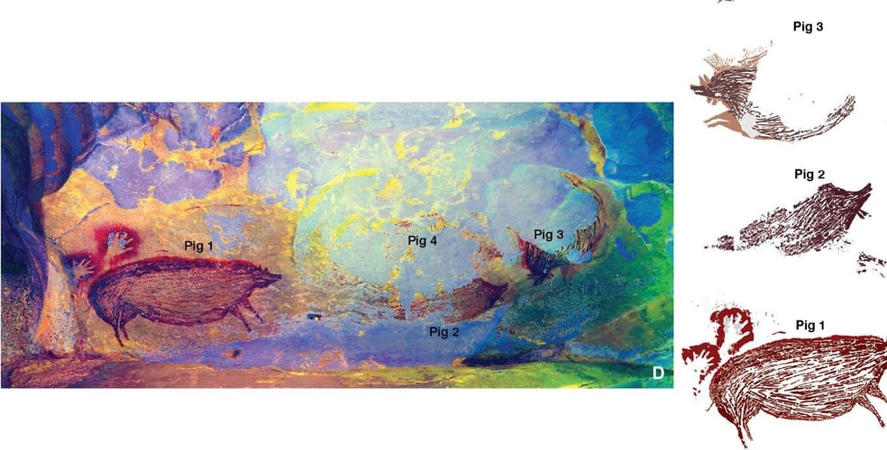 В пещере Леанг Тедунгенг нашли темно-красный рисунок бородавчатой свиньи в натуральную величину. Археологи предположили, что изображение свиньи является частью большого рисунка.