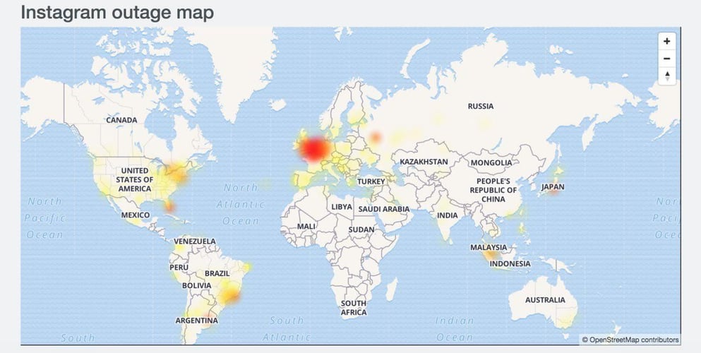 Как показывает карта сбоев, не работает соцсеть во многих регионах мира, наибольшие проблемы в Западной Европе и на восточном побережье Южной Америки. Также проблемы с Instagram есть в Украине и остальных странах Европы, а также на восточном побережье США.