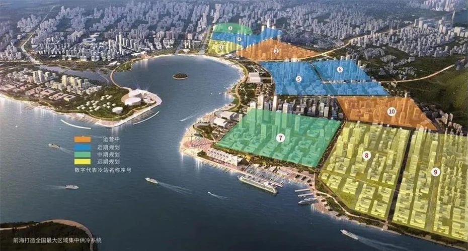 На сегодня завершено строительство трех из десяти блоков системы охлаждения, которые работают с июня 2021 года в промышленном районе Цяньхай (площадью около 15 квадратных километров). Они охватывают более 2,75 квадратных километров площади.