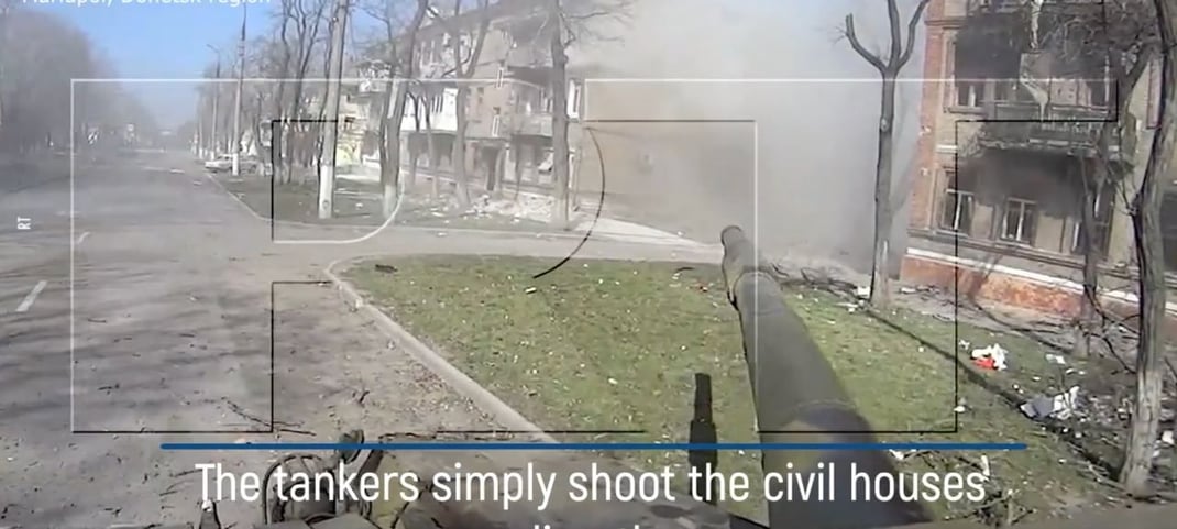 Видео снимали для пропагандистского медиа RT. Для этого российский танк в упор расстрелял гражданские дома по улице Пашковского и проспекту Первого мая.